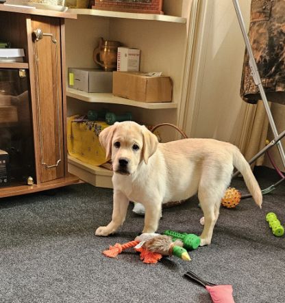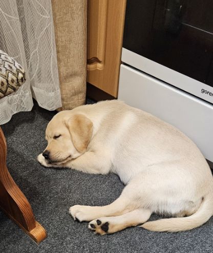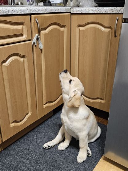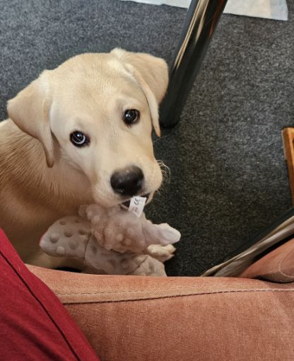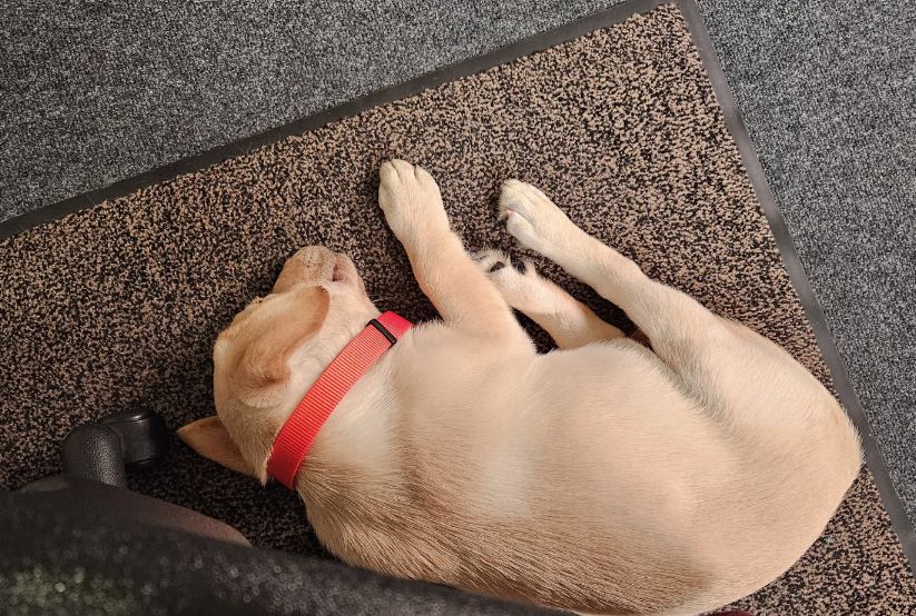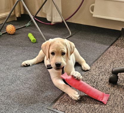 Работаю вместе с мамой, заодно готовлюсь к прогулкам, привыкаю к ошейнику! |